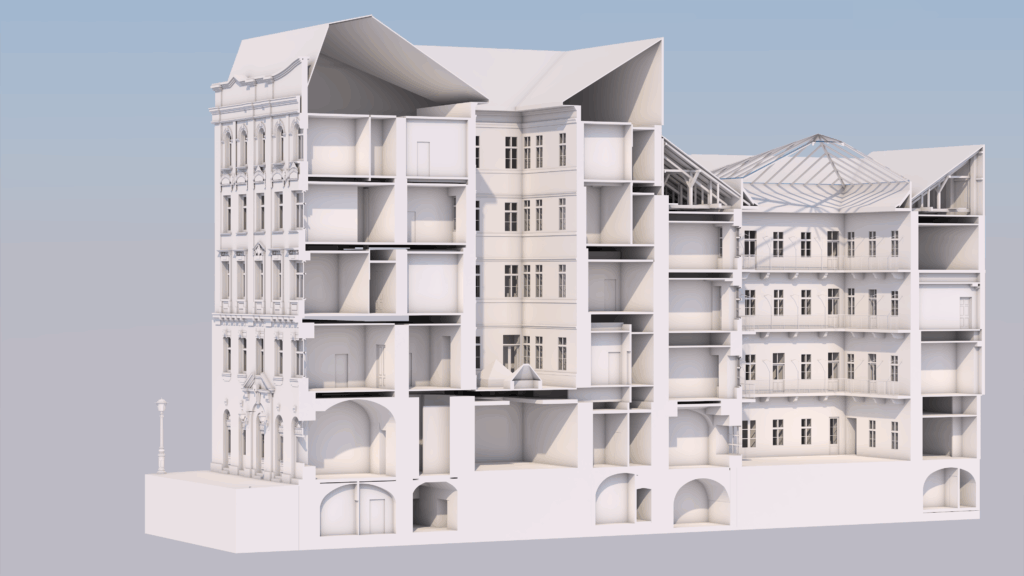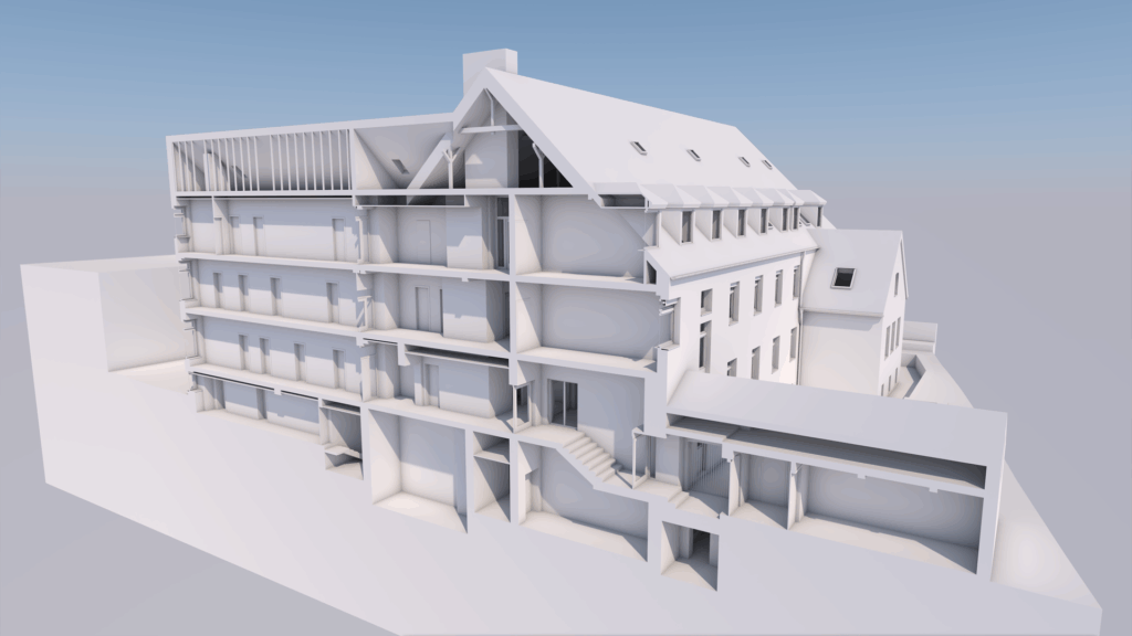 Gyakran 3D lézerszkenneléssel vagy drónos fotogrammetriával felmért pontfelhőkből dolgozunk. Ezek alapján építjük fel az épület valósághű digitális mását.